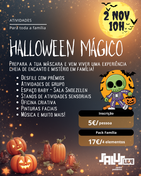 A SalusLive, centro de referência nacional na intervenção pediátrica, vai transformar-se num verdadeiro cenário de encanto e alegria no próximo dia 2 de novembro, às 10h, com o evento “Halloween Mágico”. A iniciativa promete uma manhã inesquecível, pensada para proporcionar momentos de diversão e partilha em família.