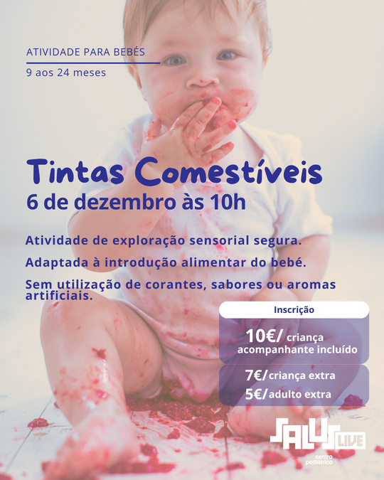 A atividade irá utilizar tintas comestíveis, uma abordagem segura e adaptada à fase de introdução alimentar, permitindo que os bebés explorem livremente sem riscos associados à ingestão acidental. As tintas utilizadas são totalmente naturais, sem corantes, sabores ou aromas artificiais, garantindo uma experiência lúdica, saudável e adequada à primeira fase de vida.