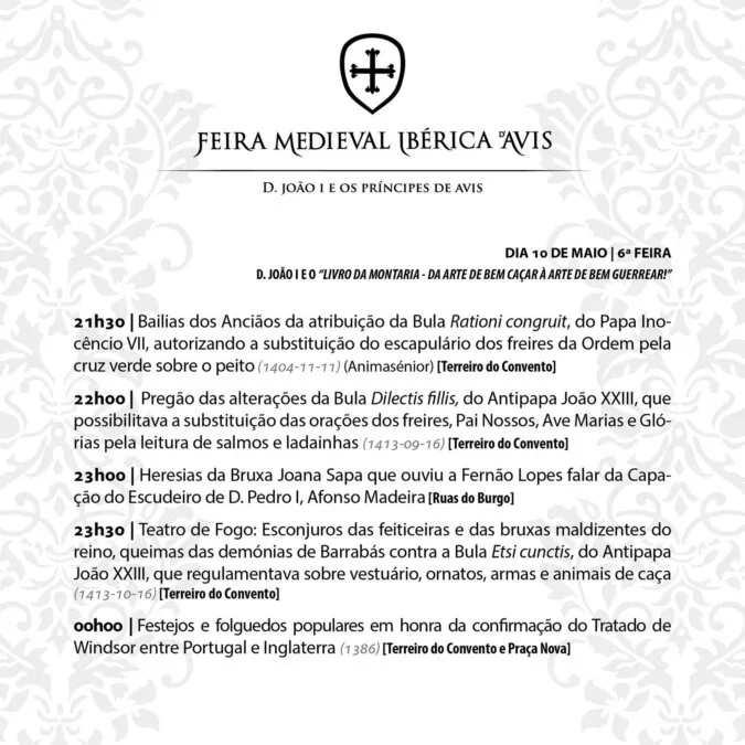 Ao longo de três dias o Centro Histórico de Avis será palco da recriação de episódios históricos que, à luz das obras literárias da autoria de D. João I e dos seus filhos D. Duarte e D. Pedro, retratam a sociedade dos séculos XIV e XV, as lutas de poder, quer de Portugal com Castela, quer dentro da própria realeza, a estratificação social, as dinâmicas e vivências quotidianas das diversas classes sociais.