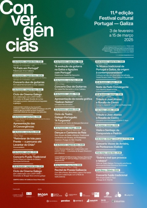 O programa, que se estende também por quatro cidades galegas, concentra-se em Braga entre 3 e 23 de fevereiro, incluindo um ciclo de cinema galego, oficinas, conferências e recitais de poesia. Há ainda concertos, como o que irá juntar o fadista Ricardo Ribeiro e Uxía Senlle, incontornável voz da tradição galega, numa noite de fado (22 de fevereiro). Os dois artistas sobem novamente ao palco no dia seguinte, num concerto do Grupo Canto D´Aqui, em que também participa Amancio Prada.