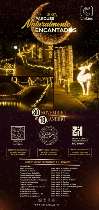 O espírito natalício regressa a Cinfães com mais encanto do que nunca. De 30 de novembro a 18 de janeiro, o concelho volta a acolher os Parques Naturalmente Encantados, uma iniciativa que transforma três espaços emblemáticos em cenários de luz, cor e magia: o Parque de Lazer do Ladário, em Cinfães; o Parque de Nossa Senhora de Lurdes, em Nespereira; e o Parque Botânico e Fluvial Temático do Rio Paiva, em Souselo.