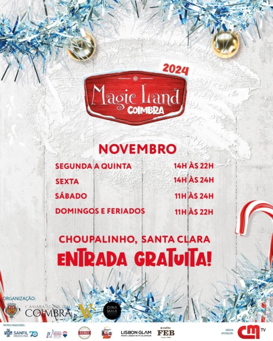 A Magia do Natal está de volta! A partir de dia 15 de Novembro, o MagicLand regressa a Coimbra! No Parque do Choupalinho, com 3000 metros quadrados de diversão! Com Árvore de Natal Gigante, Insufláveis, Comboio de Natal, Pista de Gelo, Carrosseis, Snow Slide, Mercadinhos de Natal, Artesanato, Quinta Pedagógica, Food Trucks, espétaculos de Fogo e as Paradas de Natal! Animação para miúdos e graúdos!