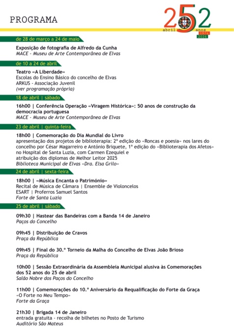 Com este programa, o Município de Elvas reafirma a importância de preservar a memória do 25 de Abril, promovendo simultaneamente a participação cívica e o acesso à cultura junto da comunidade