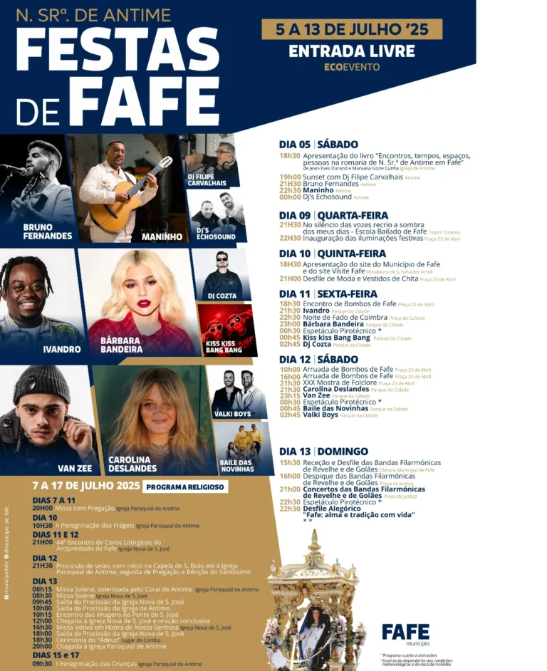 O Município de Fafe anuncia os nomes confirmados para as Festas de Fafe em honra de Nossa Senhora de Antime, as Comemorações do 25 de Abril, as Feiras Francas, a Festa Branca e o Festival da Vitela Assada à Moda de Fafe.