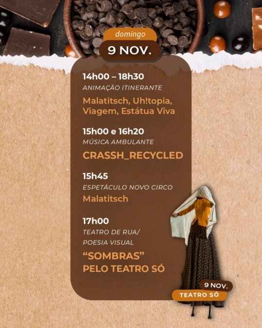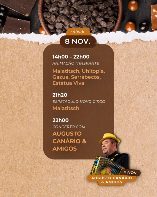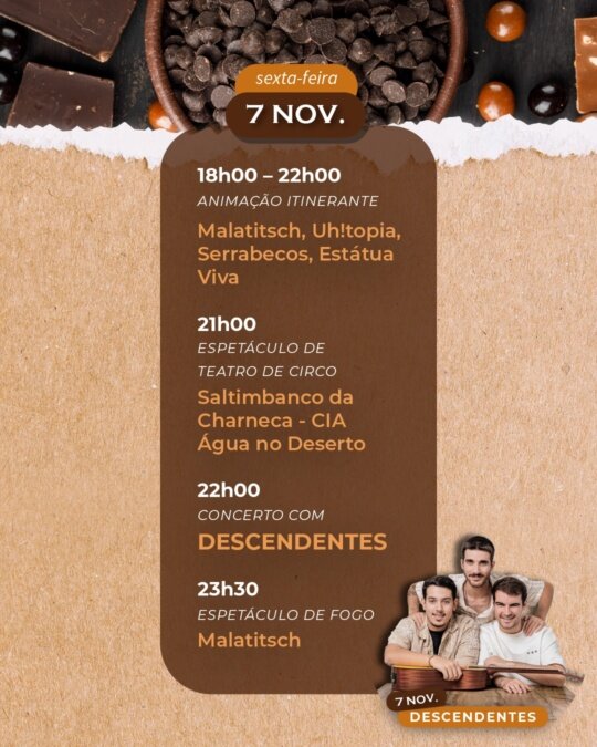 Consulte o programa e venha viver esta experiência onde o chocolate se encontra com a arte e a animação, prometendo deliciar miúdos e graúdos.