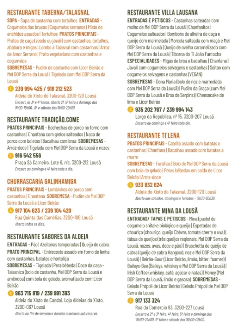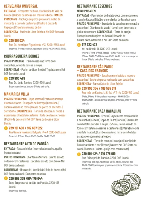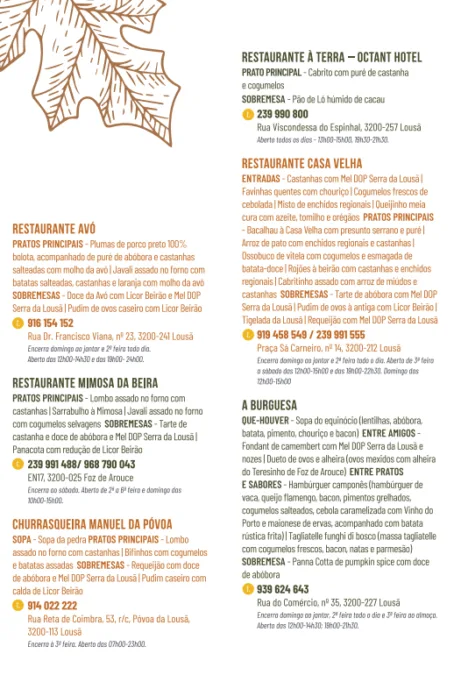 Nesta 18.ª edição, participam 20 restaurantes que, ao longo de dez dias, apresentam ementas inspiradas nos sabores e nas cores do outono, com destaque para produtos emblemáticos como a chanfana, o cabrito, os cogumelos, a castanha, o mel, os enchidos e os vinhos de Foz de Arouce. A criatividade dos chefs e o saber tradicional unem-se para proporcionar experiências únicas, num verdadeiro convite à partilha e à descoberta da autenticidade da cozinha serrana.