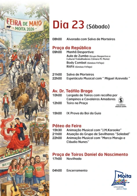 É habitualmente no quarto fim-de-semana do mês de Maio que decorre a Feira de Maio com um programa diversificado onde constam as tradicionais largadas de toiros na Av. Teófilo de Braga, na Moita, o Encontro de Aficionados, Tertúlias e Clubes Taurinos e muita música.