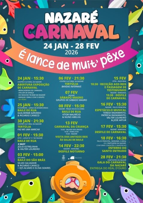 Sob o mote “É lance de muit’ pêxe”, mais uma expressão local, o programa integra exposições, bailes de rua e de sala, tertúlias, iniciativas dedicadas à infância, desfiles de rua, momentos protocolares que fazem cumprir uma longa tradição, e espetáculos musicais, fechando, como sempre, com o Enterro do Santo Entrudo e, ainda, em estreia, com a Gala do Carnaval da Nazaré, que decorrerá no cineteatro da vila.