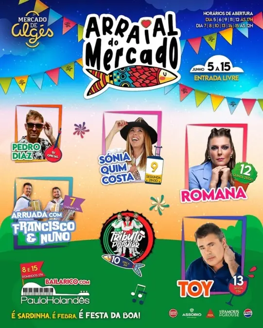 Consulte os horários, combine com os seus e apareça no Mercado de Algés — que isto vai ser sardinha no pão, música no ar e muita festa!