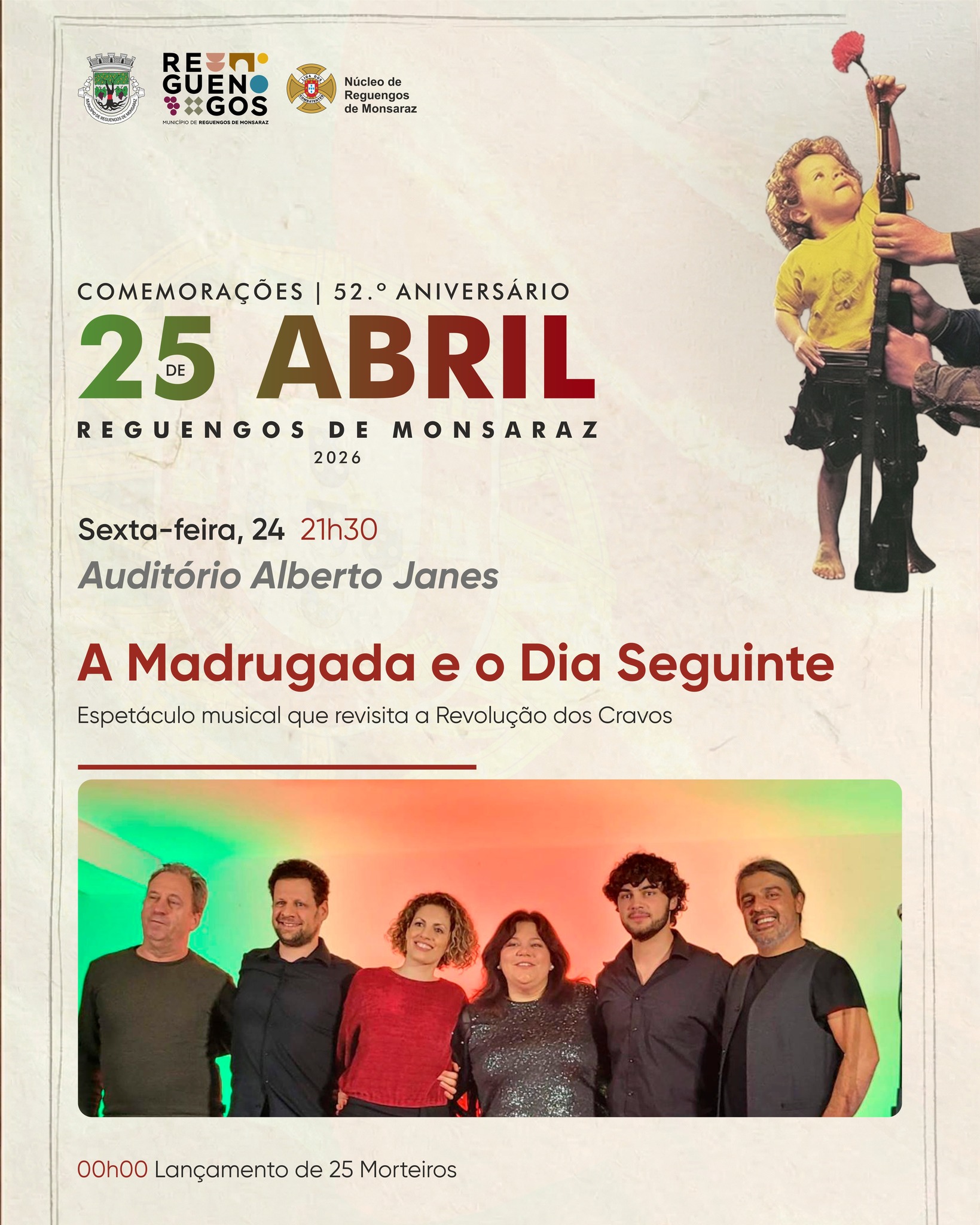 já na próxima sexta-feira, dia 24, o Auditório Alberto Janes recebe o espetáculo “A Madrugada e o Dia Seguinte”. Uma viagem musical pela história da nossa democracia que revisita a Revolução dos Cravos.