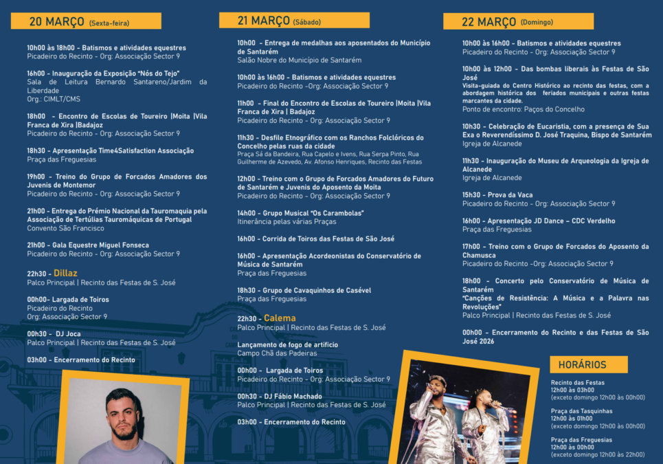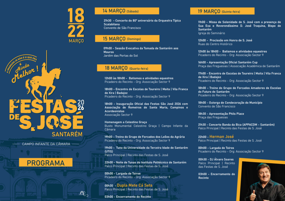 o âmbito das comemorações do Feriado Municipal que se celebra a 19 de Março (Dia de S. José – patrono dos carpinteiros e dos artífices), a Câmara Municipal de Santarém promove as Festas de S. José, com o objetivo de vivificar as tradições da nossa terra.