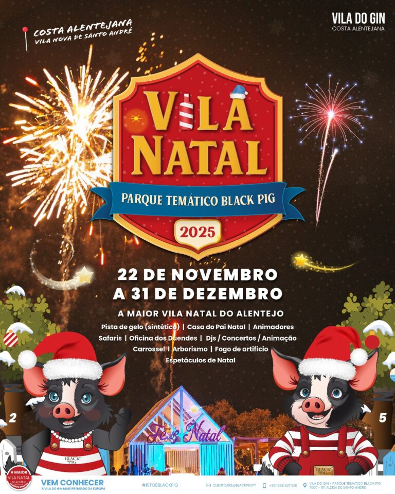 De 22 de novembro a 31 de dezembro, venha viver a experiência mais encantadora do ano na Vila Natal Black Pig, em Vila Nova de Santo André! 🏠❄️